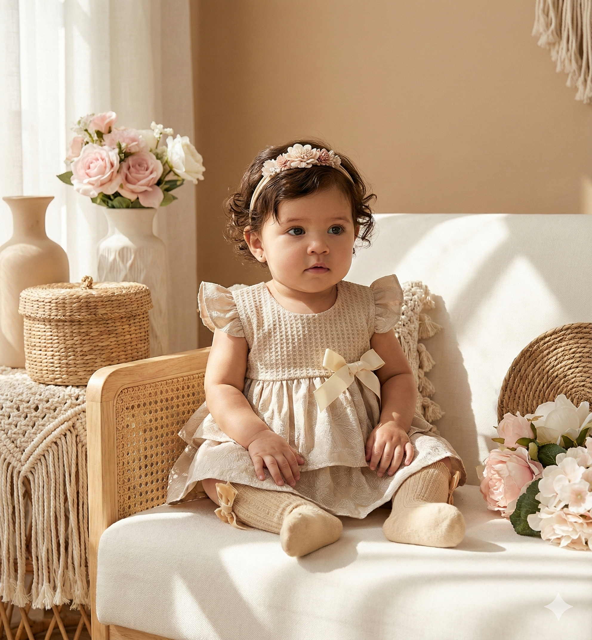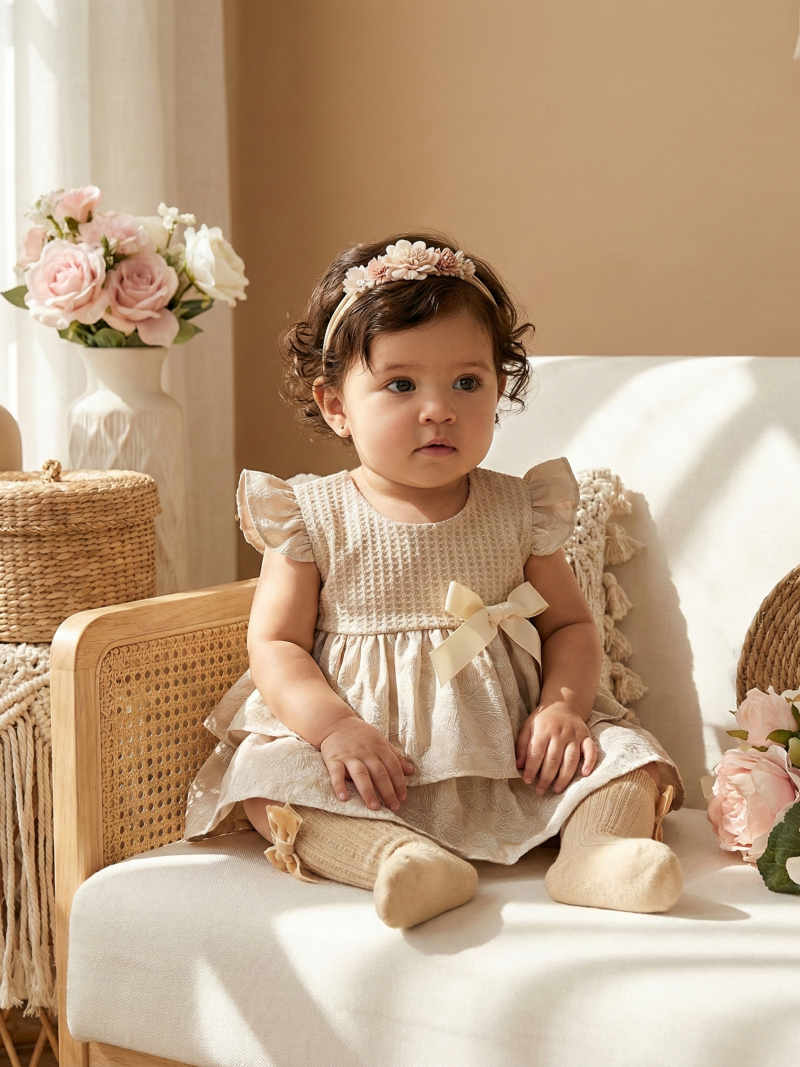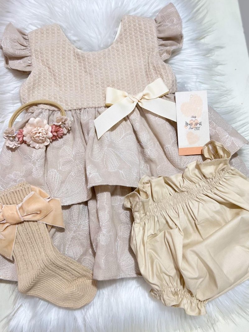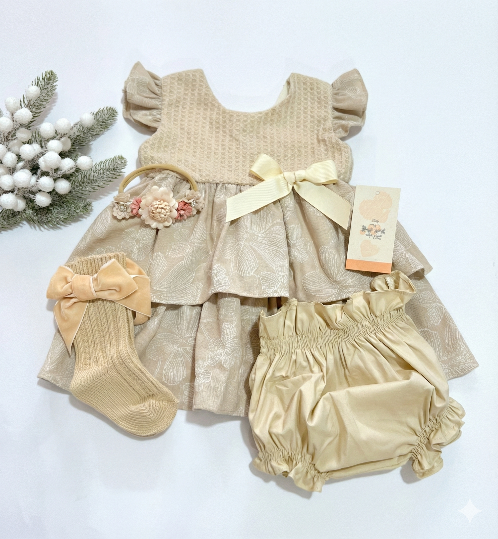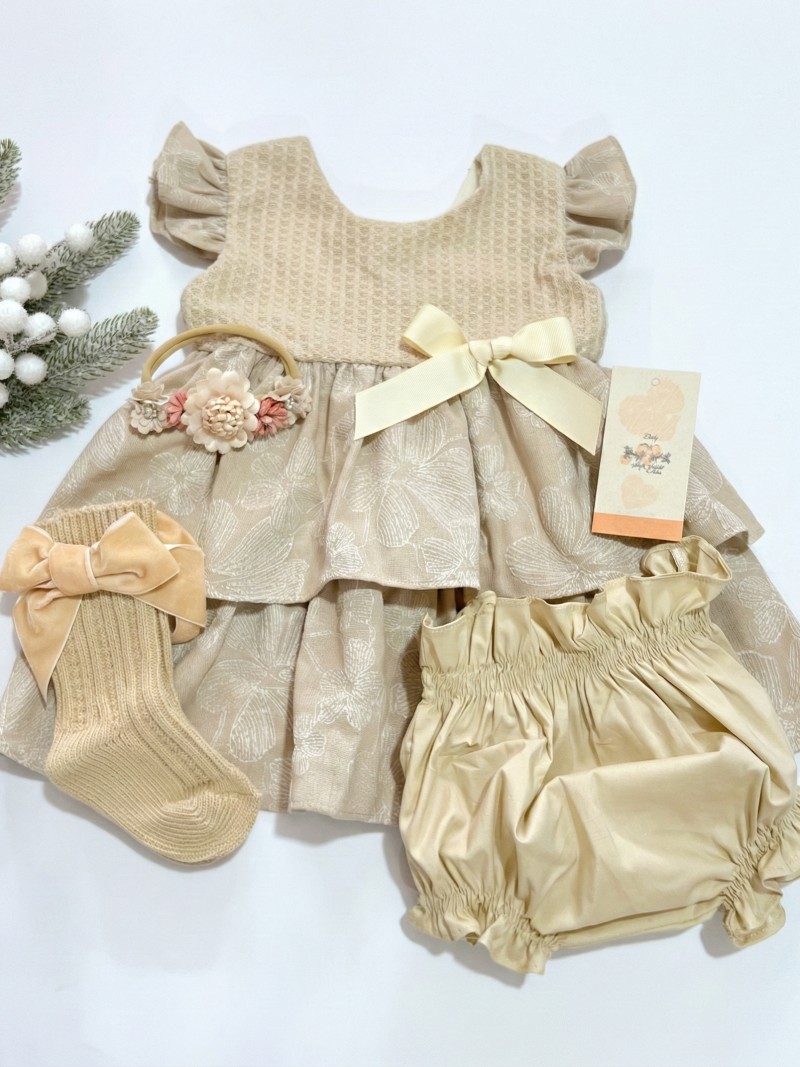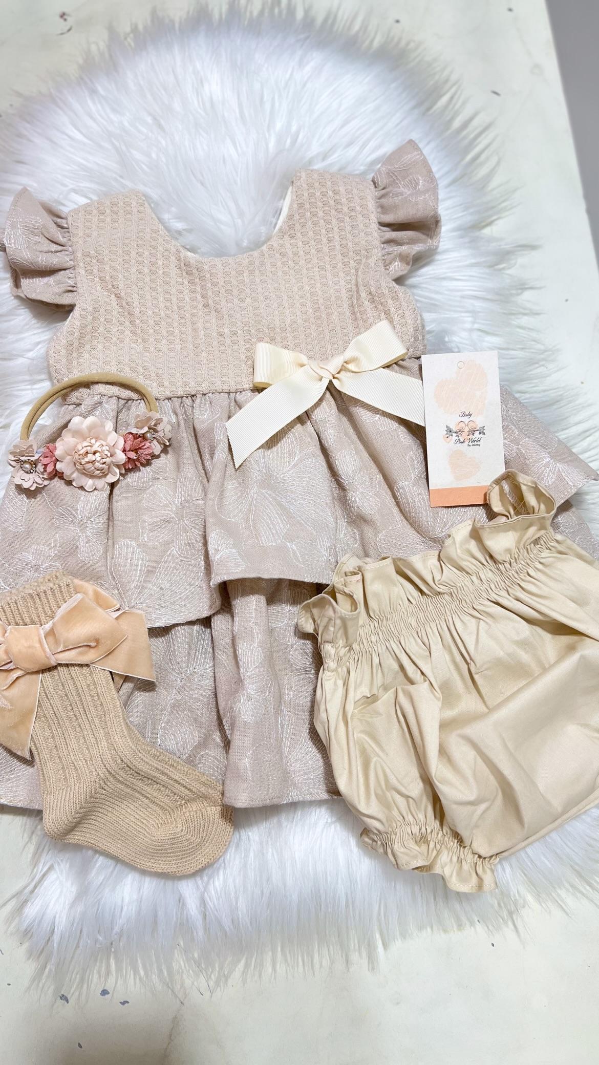 Vestido en tono beige con delicado relieve floral en matiz cobre y corte en capas. Incluye bombacha a juego y balaca floral, formando un conjunto armonioso y sofisticado, ideal para ocasiones especiales y momentos inolvidables. ✨